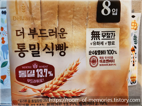 이 빵은 처음 구매해보았는데요, 맛있어서 적어보았습니다. 보통 통밀로 만든 빵은 푸석푸석하고 거친 식감이어서 주로 버터로 구워서 먹었었습니다. 그런데 이 상품은 통밀이 13.71% 정도로 들어있어서 그런지 이름 그대로 부드러운 식감이었습니다.