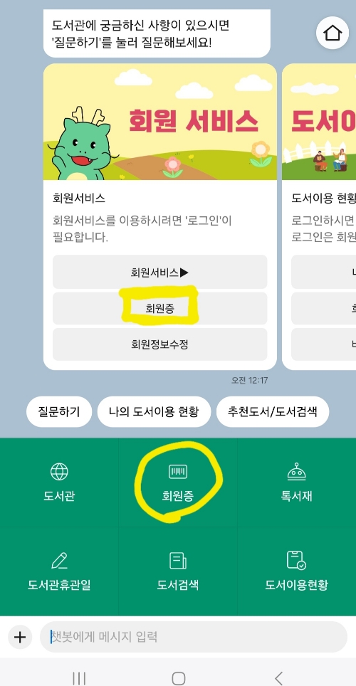 카카오톡에서 용인시 도서관을 친구추가한 후 회원증을 선택한 사진
