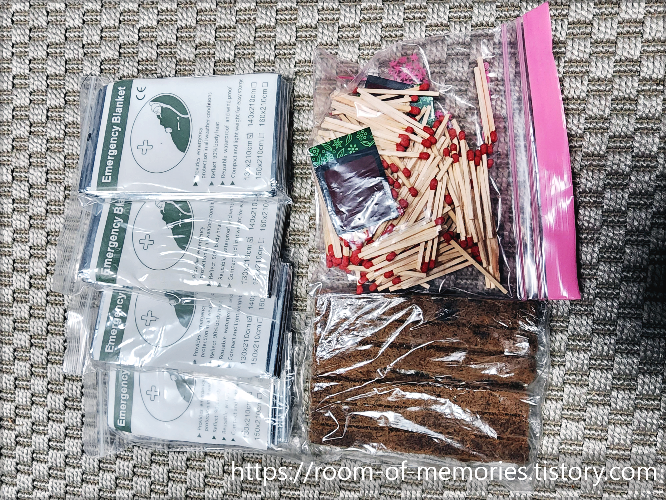 성냥은 방수성냥이 비싸서 팔각성냥을 사서 담아두었다. 물이 들어가지 않도록 지퍼백에 이중으로 넣어놓아야겠다. 그래도 젖을 때를 대비해서 큰 라이터도 구매해서 넣어두어야겠다.